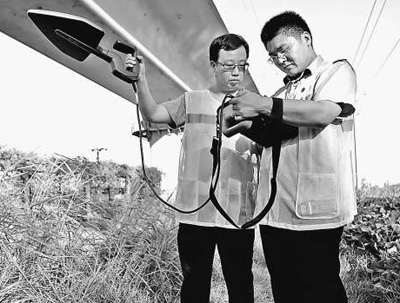 白文峰(右)和同事测量高铁通信信号。(徐驰 摄)