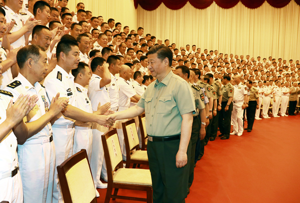 5月24日,中共中央总书记、国家主席、中央军委主席习近平视察海军机关,亲切接见海军第十二次党代会全体代表和海军机关正师职以上领导干部。这是习近平听取海军工作汇报后发表重要讲话。(新华社记者 查春明 摄)