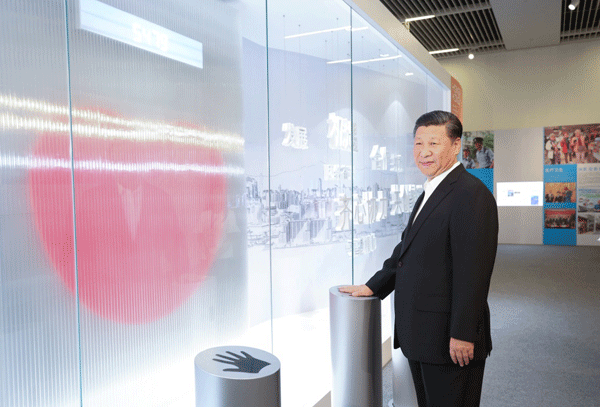 6月26日,中共中央总书记、国家主席、中央军委主席习近平在国家博物馆参观香港回归祖国20周年成就展。这是习近平按下“同心圆”互动装置的触摸板。这个“同心圆”互动装置代表着香港同胞和内地同胞齐心协力、携手合作,一起为国家发展贡献力量。新华社记者姚大伟摄