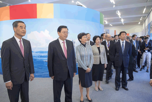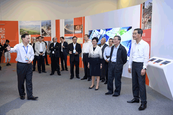 香港政权交接仪式上五星红旗迎风高展,东亚运动会香江健儿主场夺冠,四川震后香港援建项目传递同胞手足深情,建设中的港珠澳大桥勾画大湾区发展广阔前景,“沪港通”、“深港通”丰富香港国际金融中心内涵,“一带一路”建设激发香港国际化城市新的潜能……一幅幅绚丽的图片,一组组翔实的数据以及精彩的微缩模型和多媒体演示,吸引了习近平等领导同志的目光。他们不时停下脚步仔细观看,认真听取工作人员讲解,并详细询问有关情况。