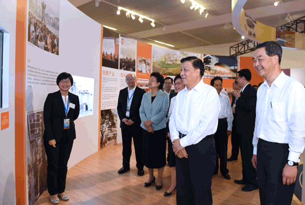 下午3时,习近平等领导同志来到国家博物馆,在全国政协副主席、香港特别行政区行政长官梁振英等陪同下走进展厅参观展览。展览由香港特别行政区政府主办,以“同心创前路,掌握新机遇”为主题,共分“一国两制”、“香港近况一览”、“一起紧握机遇”、“一起拓展商贸”、“一起推陈出新”、“一起携手经历”、“一起紧扣相连”、“一起凝聚力量”、“一起保育承传”以及“结语”等10个展区,通过大量图表、模型以及多媒体互动内容,全面展现香港回归祖国20年特别是近5年来各项事业取得的巨大成就。