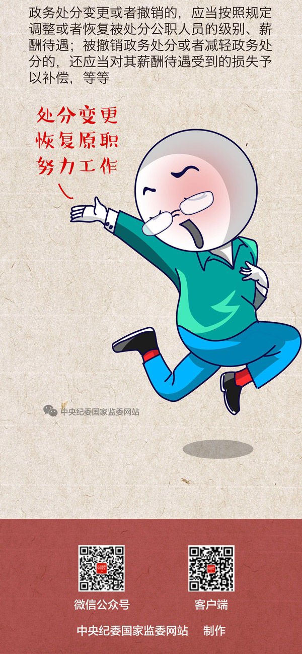 第六十条 公职人员的政务处分决定被变更,需要调整该公职人员的职务、职级、衔级、级别、岗位和职员等级或者薪酬待遇等的,应当按照规定予以调整。政务处分决定被撤销的,应当恢复该公职人员的级别、薪酬待遇,按照原职务、职级、衔级、岗位和职员等级安排相应的职务、职级、衔级、岗位和职员等级,并在原政务处分决定公布范围内为其恢复名誉。没收、追缴财物错误的,应当依法予以返还、赔偿。