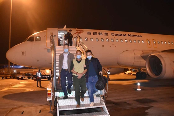 2020年10月20日晚,四川省巴中市巴州区潜逃职务犯罪嫌疑人邓文双被抓捕归案,黎明 摄于重庆江北机场