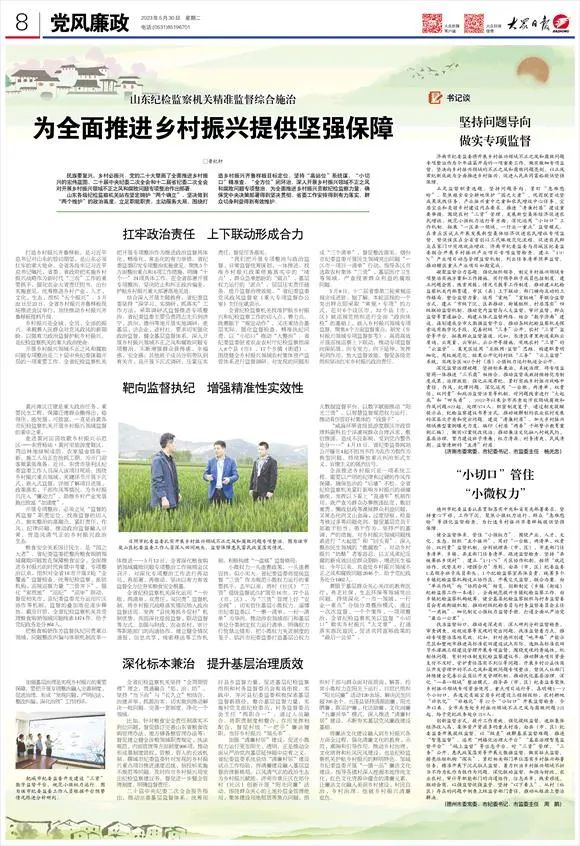 2023年5月30日,《大众日报》“党风廉政”专版刊发《山东纪检监察机关精准监督综合施治 为全面推进乡村振兴提供坚强保障》。全文如下: